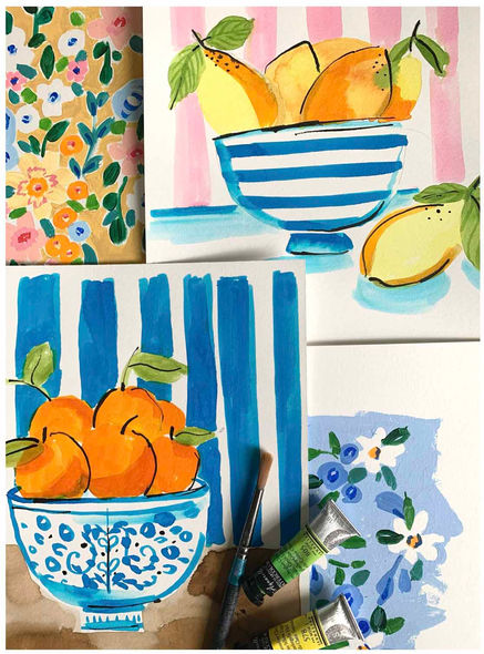 Her style is whimsical, colourful, fun and painterly. Emma works traditionally, developing and finishing her designs on the computer.